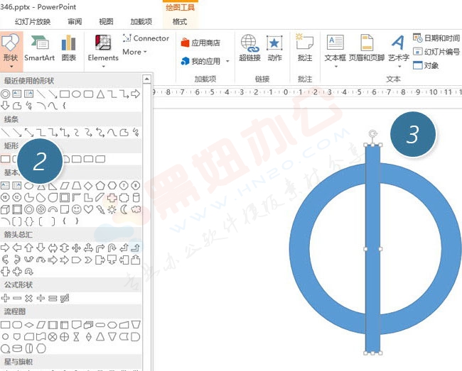 接下来插入矩形(下图 2 处),注意矩形的小宽度,保证矩形有旋转调节钮。(下图 3 处)