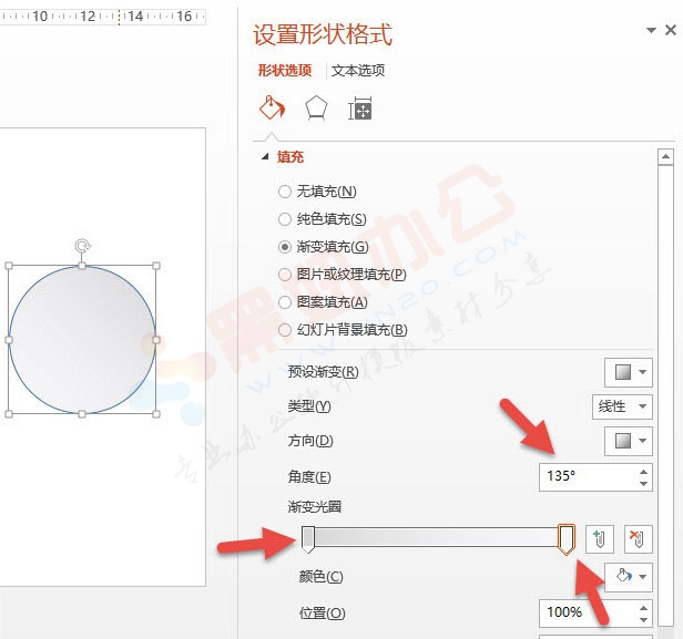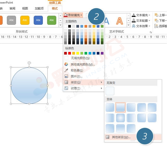 选中圆形,在“形状填充”中选择“渐变—其他渐变”(下图 3 处)
