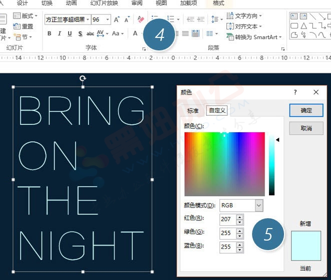 紧接着将字体的颜色设置为下图颜色。RGB:207:255:255(下图5处)