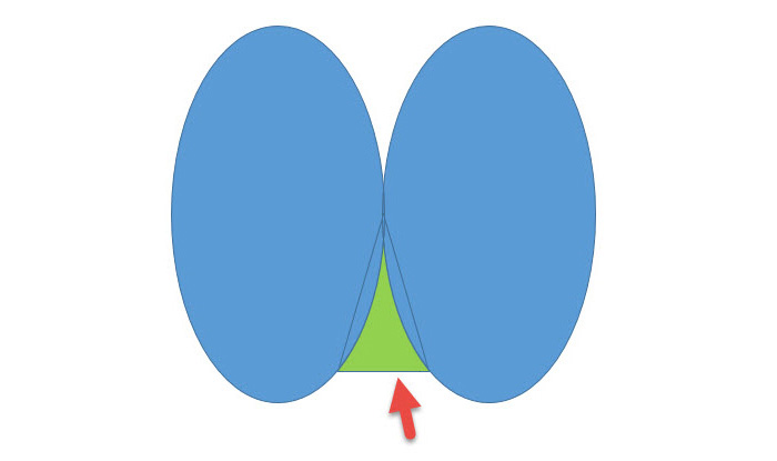 接着插入一个椭圆形,椭圆要足够大,注意椭圆与等腰三角形的“相交”处。(下图箭头处)