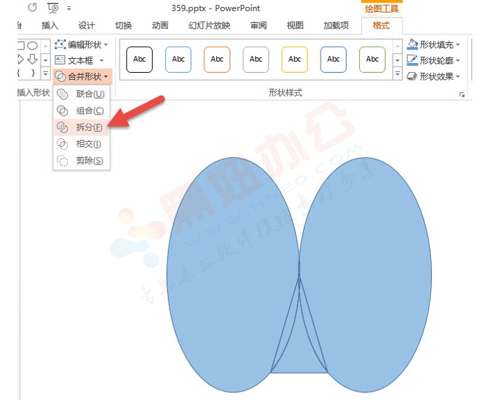 选中半透明椭圆,按住Ctrl+Shift键,再复制拖拽一个椭圆,同样相交到等腰三角形的另外一边,然后同时选中这三个图形,点击“合并形状—拆分”(下图箭头处)效果如下:
