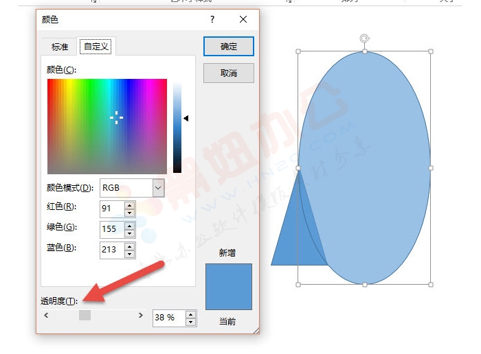 将其透明度设置为大约30%左右。下图箭头处。设置完毕后,椭圆变成半透明状态。