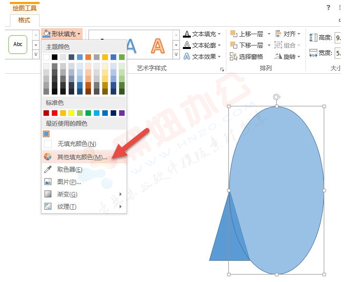 为了方便能够看清“相交“的位置,可以将椭圆设置为半透明状态。设置方法如下:选中椭圆,然后点击“形状填充—其他颜色填充“按钮。(下图箭头处)