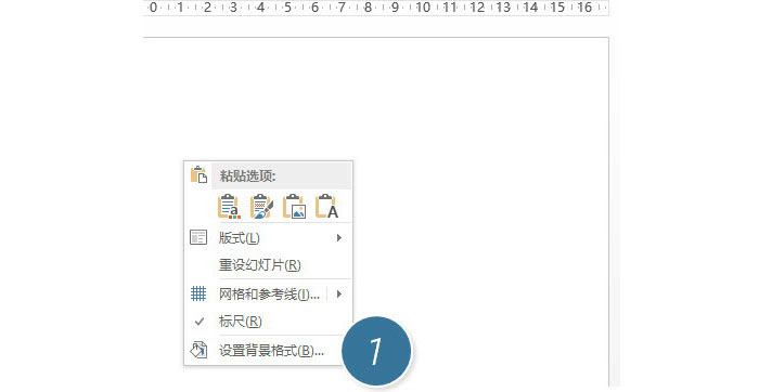 具体操作方法如下:新建一个PPT,在空白处点击鼠标右键,在新弹菜单中“设置背景格式”。(下图1处)