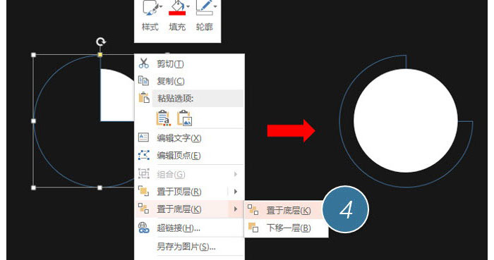 选中饼图,点击鼠标右键,将其至于底层,将黑色饼形置于白圆的下方。(下图4处)