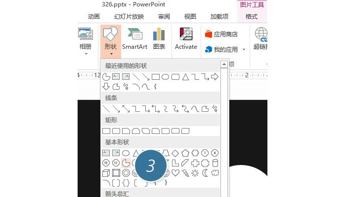 接着,选择“插入-形状-饼形”,按住Shift键,拖拽出一个饼形。(下图3处)