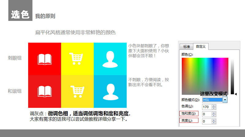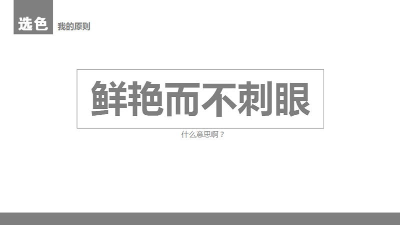 扁平化PPT设计制作教程2:颜色与色块的使用技巧;颜色选色、鲜艳而不刺眼 PPT扁平化设计,通常使用非常鲜艳的颜色 配色、背景色重要到要单独拿出来了!确定PPT背景色。 暖色:不建议,容易亮瞎观众眼球,而且看久了眼睛会有视色错觉现象(就是跟残像一个意思,嗯,差不多);冷色:比较常见使用的时候注意图元素颜色的兼容,例如跟图表、色块颜色的对比一定要够大。图片:图片简单的可以直接使用,复杂的建议先做模糊