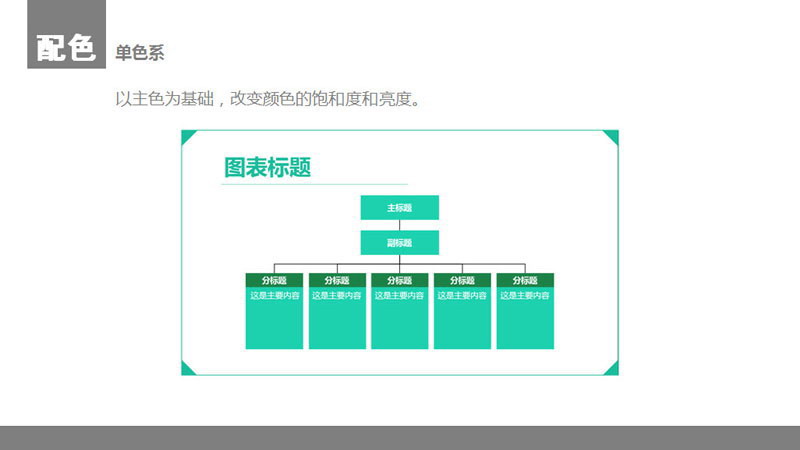 单色系PPT制作:以主色为基础,改变颜色的饱和度和亮度。