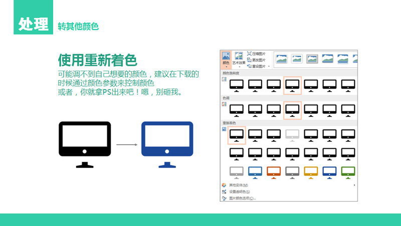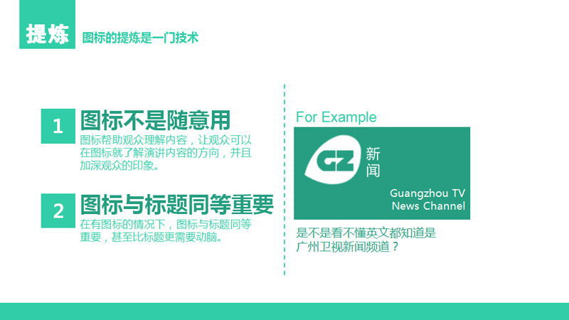 扁平化PPT设计制作教程3:图标提炼、PPT图标的提炼是一门技术图标不是随意用图标帮助观众理解内容,让观众可以在图标就了解演讲内容的方向,并且加深观众的印象。图标与标题同等重要在有图标的情况下,图标与标题同等重要,甚至比标题更需要动脑。  仅从标题或正文中的某些名词中提炼图标,在大部分情况下是正确的,但是也存在图表贴切与否的问题。推荐几种获取方式处理、获取PPT图标后的处理方法: